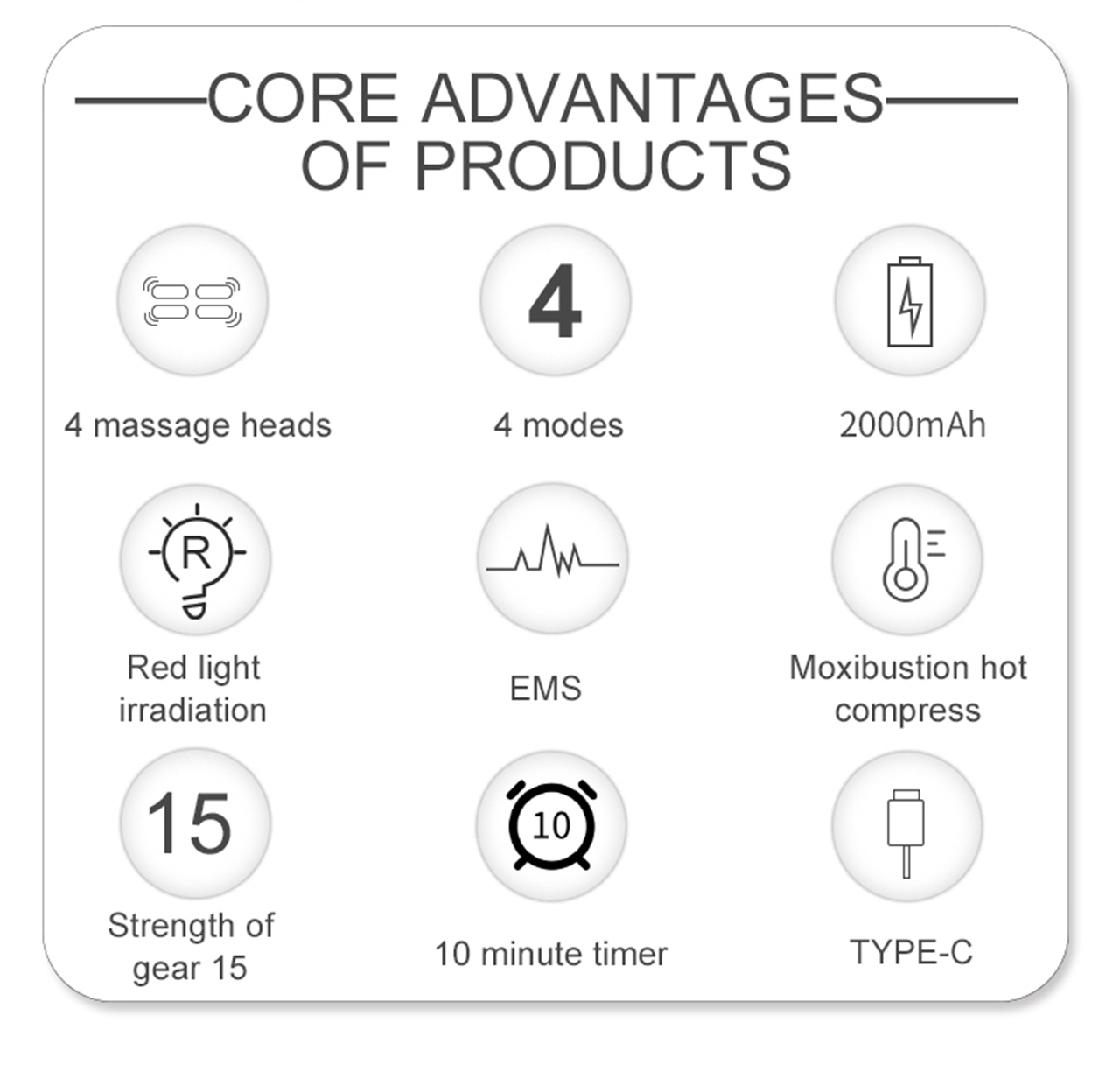 맥박, 뜸, 붉은 빛과 결합된 플로팅 마사지 헤드를 사용하여 압력을 완전히 해제하십시오.